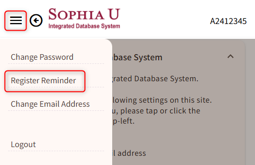 If you have blocked the [Reminder mail] from being received, please set your email address to receive mail from “sophia.ac.jp” in advance.
