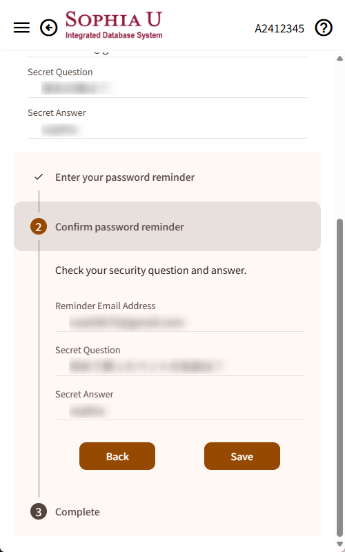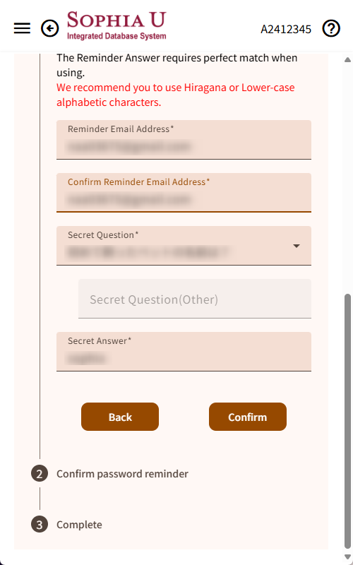 - Enter [Reminder Email Address], [Confirm Reminder Email Address], [Secret Question], and [Secret Answer], then click [Confirm].