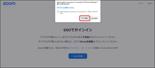 - 認証に成功すると、ダイアログが表示されるので、[リンクを開く]をクリックしてください。ダイアログが表示されない場合は[Zoomを起動]をクリックしてください。